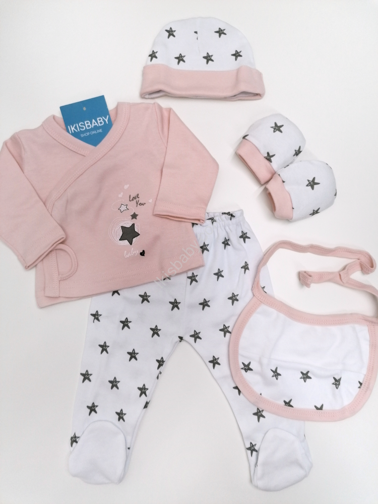 Inclui conjunto de 2 peças, gorro , luvas e babete.